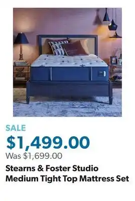 This offer is available in various stores, view all products to get the cheapest Stearns & Foster Studio Medium Tight Top Mattress Set. If you'd like to find out whether this product has a bigger discount in another store, check the category 'Wholesale'. You may also find these offers interesting: Stearns & Foster Studio 14 Medium Tight Top Queen Mattress, Stearns & Foster Studio Medium Pillow Top Mattress Set & Serta Blue Lagoon Nights 13.5 Medium Tight Top Queen Mattress.