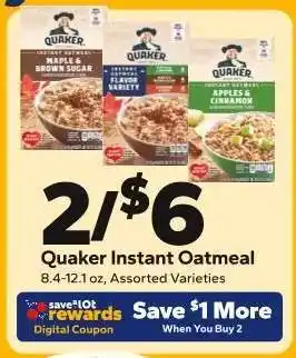 The Quaker Instant Oatmeal is now on sale at Save a Lot, valid from 31-12-2025 to 06-01-2026. Check out the latest Save a Lot weekly ad for more exclusive offers. Order Quaker Instant Oatmeal online via the Save a Lot website or buy it at a nearby store. At Adspecials.us, you'll always find the best Quaker Instant Oatmeal deals. Compare the current offers to see if Quaker Instant Oatmeal will be featured in next week’s weekly ad. We post the weekly ads quickly, so you can plan your shopping smartly and stay updated on the latest Quaker Instant Oatmeal deals, discovering which stores have the best offers. Adjust your shopping list and check out the Save a Lot weekly ad for next week for exclusive in-store promotions.Frequently asked questions about Quaker Instant Oatmeal