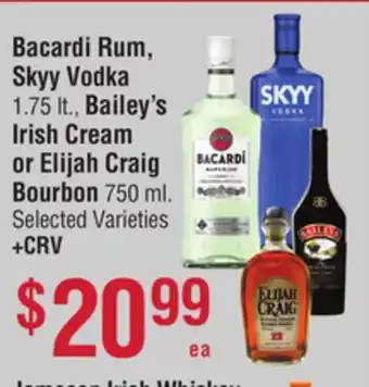 Bacardi Rum, Skyy Vodka 1.75 lt., Bailey's Irish Cream or Elijah Craig Bourbon 750 ml Deal at Smart & Final