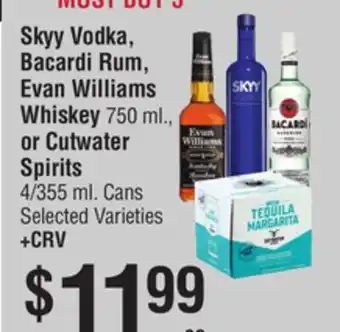 Skyy Vodka, Bacardi Rum, Evan Williams Whiskey 750 ml., or Cutwater Spirits 4/355 ml. Cans