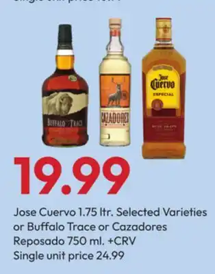 Current Jose Cuervo 1.75 ltr. Selected Varieties or Buffalo Trace or Cazadores Reposado 750 ml deal at Stater Bros from 31-12 until 6-01.