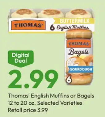 This offer is available in various stores, view all products to get the cheapest Thomas' English Muffins or Bagels. If you'd like to find out whether this product has a bigger discount in another store, check the category 'Grocery'. You may also find these offers interesting: Thomas' Bagels, Breakfast Bread or English Muffins 6 ct. or Breakfast Breads 16 oz, Thomas' Bagels, Breakfast Bread or English Muffins 6 ct. or Breakfast Breads 16 oz & Thomas' English Muffins.