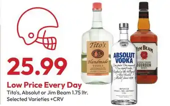 The price of Tito's, Absolut or Jim Beam can be found at the top of the page, together with the dates during which the offer is available. You can also check the price in the current Stater Bros weekly ad or on the Stater Bros website. Promotional offers assure you of buying Stater Bros products at the lowest price.