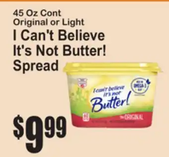 SuperFresh offers a wide collection of products, besides the 45 Oz Cont Original or Light I Can't Believe It's Not Butter! Spread. Keep an eye on the weekly weekly ad to find the best offers and promotions. Besides 45 Oz Cont Original or Light I Can't Believe It's Not Butter! Spread, you can also find the following offers: I Can't Believe It's Not Butter!, I Can't Believe It's Not Butter! Spray & Country Crock Butter Spread.