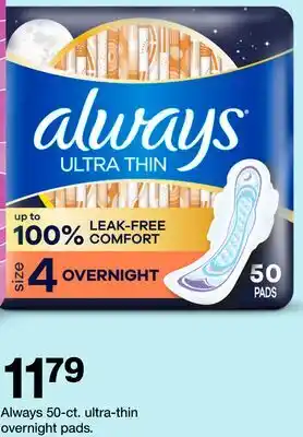 This offer is available in various stores, view all products to get the cheapest Always 50-ct. ultra-thin overnight pads. If you'd like to find out whether this product has a bigger discount in another store, check the category 'Electronics'. You may also find these offers interesting: Always Ultra Thin or Pocket FlexFoam Pads, Carefree Ultra Thin Pads & Always Discreet Liners 44 or 48 ct. or Pads* 20 or 30 ct.
