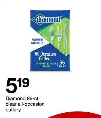 This offer is available in various stores, view all products to get the cheapest Diamond 96-ct. clear all-occasion cutlery. If you'd like to find out whether this product has a bigger discount in another store, check the category 'Electronics'. You may also find these offers interesting: All free & clear mighty packs 39 ct. or laundry detergent, All Free & Clear Fabric Softener & All Mighty Pacs Free & Clear.