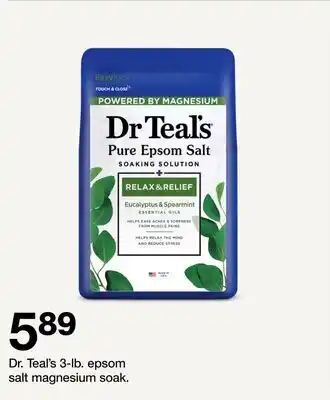 Target offers a wide collection of products, besides the Dr. Teal's 3-lb. epsom salt magnesium soak. Keep an eye on the weekly Target weekly ad to find the best offers and promotions. Besides Dr. Teal's 3-lb. epsom salt magnesium soak, you can also find the following offers: Dr Teal's Epsom Salt, Dr Teal's Epsom Salt & Dr. Teal's Foaming Bath or Epsom Salt.