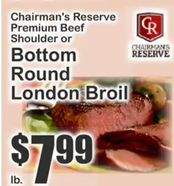 This offer is available in various stores, view all products to get the cheapest Chairman's Reserve Premium Beef Shoulder or Bottom Round London. If you'd like to find out whether this product has a bigger discount in another store, check the category 'Grocery'. You may also find these offers interesting: Chairman's Reserve Premium Beef, Chairman's Reserve Premium Beef Round For Cube Steak & Chairman's Reserve Premium Beef Boneless Beef Round For Stir Fry.