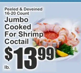 This offer is available in various stores, view all products to get the cheapest Jumbo Cooked For Shrimp Coctail. If you'd like to find out whether this product has a bigger discount in another store, check the category 'Grocery'. You may also find these offers interesting: Cooked Shrimp, Cooked Shrimp & Jumbo Shrimp.