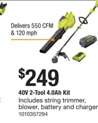 The Home Depot offers a wide collection of products, besides the 40V 2-Tool 4.0Ah Kit. Keep an eye on the weekly The Home Depot flyer to find the best offers and promotions. Besides 40V 2-Tool 4.0Ah Kit, you can also find the following offers: RYOBI 40V 2-Tool 4.0Ah Kit, V20 4-Tool Combo Kit & 20-V MaxF 2-Tool Combo Kit.