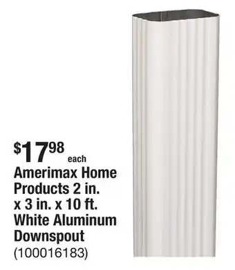 The price of Amerimax Home Products 2 in. x 3 in. x 10 ft. White Aluminum Downspout can be found at the top of the page, together with the dates during which the offer is available. You can also check the price in the current The Home Depot flyer or on the The Home Depot website. Promotional offers assure you of buying The Home Depot products at the lowest price.