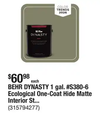 The BEHR DYNASTY 1 gal. #S380-6 Ecological One-Coat Hide Matte Interior Stain-Blocking Paint & Primer is now on sale at The Home Depot, valid from 08-01-2026 to 15-01-2026. Check out the latest The Home Depot weekly ad for more exclusive offers. Order BEHR DYNASTY 1 gal. #S380-6 Ecological One-Coat Hide Matte Interior Stain-Blocking Paint & Primer online via the The Home Depot website or buy it at a nearby store. At Adspecials.us, you'll always find the best BEHR DYNASTY 1 gal. #S380-6 Ecological One-Coat Hide Matte Interior Stain-Blocking Paint & Primer deals. Compare the current offers to see if BEHR DYNASTY 1 gal. #S380-6 Ecological One-Coat Hide Matte Interior Stain-Blocking Paint & Primer will be featured in next week’s weekly ad. We post the weekly ads quickly, so you can plan your shopping smartly and stay updated on the latest BEHR DYNASTY 1 gal. #S380-6 Ecological One-Coat Hide Matte Interior Stain-Blocking Paint & Primer deals, discovering which stores have the best offers. Adjust your shopping list and check out the The Home Depot weekly ad for next week for exclusive in-store promotions.Frequently asked questions about BEHR DYNASTY 1 gal. #S380-6 Ecological One-Coat Hide Matte Interior Stain-Blocking Paint & Primer