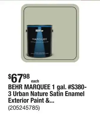 The price of BEHR MARQUEE 1 gal. #S380-3 Urban Nature Satin Enamel Exterior Paint & Primer can be found at the top of the page, together with the dates during which the offer is available. You can also check the price in the current The Home Depot flyer or on the The Home Depot website. Promotional offers assure you of buying The Home Depot products at the lowest price.