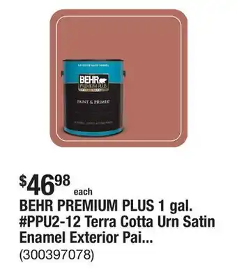 The Home Depot offers a wide collection of products, besides the BEHR PREMIUM PLUS 1 gal. #PPU2-12 Terra Cotta Urn Satin Enamel Exterior Paint & Primer. Keep an eye on the weekly The Home Depot flyer to find the best offers and promotions. Besides BEHR PREMIUM PLUS 1 gal. #PPU2-12 Terra Cotta Urn Satin Enamel Exterior Paint & Primer, you can also find the following offers: BEHR MARQUEE 1 gal. #S380-3 Urban Nature Satin Enamel Exterior Paint & Primer, BEHR PREMIUM PLUS 1 gal. #MQ1-15 Rumors Flat Low Odor Interior Paint & Primer & BEHR PREMIUM PLUS 5 gal. #PR-W15 Ultra Pure White Flat Low Odor Interior Paint & Primer.