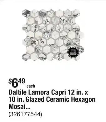 The Home Depot offers a wide collection of products, besides the Daltile Lamora Capri 12 in. x 10 in. Glazed Ceramic Hexagon Mosaic Tile (0.81 sq. ft./each). Keep an eye on the weekly The Home Depot flyer to find the best offers and promotions. Besides Daltile Lamora Capri 12 in. x 10 in. Glazed Ceramic Hexagon Mosaic Tile (0.81 sq. ft./each), you can also find the following offers: Daltile Rorington Taupe 12 in. x 24 in. Glazed Porcelain Floor and Wall Tile (17.6 sq. ft. /case), Ivy Hill Tile Aerial Turquoise 2.83 in. x 7.67 in. Polished Ceramic Wall Tile (5.15 sq. ft./Case) & Vistaframe Pearl White 3-in x 12-in Glossy Ceramic Subway Wall Tile (0.25-sq ft Piece).