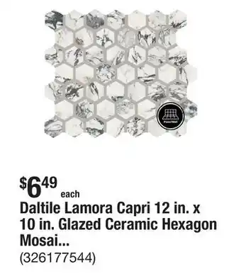 The Home Depot offers a wide collection of products, besides the Daltile Lamora Capri 12 in. x 10 in. Glazed Ceramic Hexagon Mosaic Tile (0.81 sq. ft./each). Keep an eye on the weekly The Home Depot flyer to find the best offers and promotions. Besides Daltile Lamora Capri 12 in. x 10 in. Glazed Ceramic Hexagon Mosaic Tile (0.81 sq. ft./each), you can also find the following offers: Daltile Vistaframe Olive 3-in x 12-in Glossy Ceramic Wall Tile, Vistaframe Pearl White 3-in x 12-in Glossy Ceramic Subway Wall Tile (0.25-sq ft Piece) & MSI Lockson Mix 4 in. x 16 in. Glossy Ceramic Marble Look Wall Tile (17.6 sq. ft./Case).