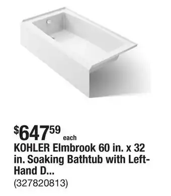 The KOHLER Elmbrook 60 in. x 32 in. Soaking Bathtub with Left-Hand Drain in White is now on sale at The Home Depot, valid from 08-01-2026 to 15-01-2026. Check out the latest The Home Depot weekly ad for more exclusive offers. Order KOHLER Elmbrook 60 in. x 32 in. Soaking Bathtub with Left-Hand Drain in White online via the The Home Depot website or buy it at a nearby store. At Adspecials.us, you'll always find the best KOHLER Elmbrook 60 in. x 32 in. Soaking Bathtub with Left-Hand Drain in White deals. Compare the current offers to see if KOHLER Elmbrook 60 in. x 32 in. Soaking Bathtub with Left-Hand Drain in White will be featured in next week’s weekly ad. We post the weekly ads quickly, so you can plan your shopping smartly and stay updated on the latest KOHLER Elmbrook 60 in. x 32 in. Soaking Bathtub with Left-Hand Drain in White deals, discovering which stores have the best offers. Adjust your shopping list and check out the The Home Depot weekly ad for next week for exclusive in-store promotions.Frequently asked questions about KOHLER Elmbrook 60 in. x 32 in. Soaking Bathtub with Left-Hand Drain in White