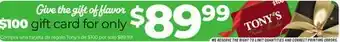 This $100 gift card is now on sale at Tony’s Fresh Market. Make sure to check out the current Tony’s Fresh Market leaflet, full of competitive deals and discounts. Purchase $100 gift card online via Tony’s Fresh Market website or buy it for the best available price at a store near you. Adspecials.us always gathers the best $100 gift card offers, especially for you. Do you want to be the first one to be informed? Click on the bell icon and receive a free message when the product is on offer or available on the flyer.Is there a promotion on $100 gift card in next week’s Tony’s Fresh Market ad?