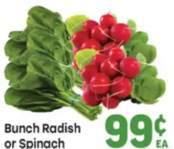 This offer is available in various stores, view all products to get the cheapest Bunch Radish or Spinach. If you'd like to find out whether this product has a bigger discount in another store, check the category 'Grocery'. You may also find these offers interesting: Bunch Spinach, BUNCH RADISHES or BUNCH SPINACH & California BUNCH SPINACH.