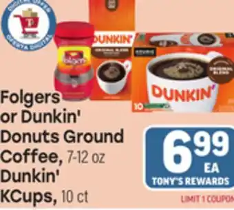 Folgers or Dunkin' Donuts Ground Coffee, 7-12oz Dunkin' KCups, 10ct deal in the weekly ad of Tony’s Fresh Market