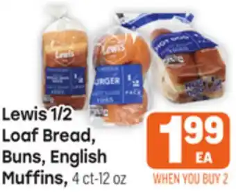In which store will Lewis 1/2 Loaf Bread Buns, English Muffins be on sale next week? These are some of the questions we get asked a lot. It’s only normal, nobody likes to pay too much! Our team keeps an eye on all deals and lists them online as soon as possible. So you can customize your (shopping) list with this week's offers and those of next week. Make sure to check next week’s Tony’s Fresh Market ad, some of the specials are only available next week or online.Frequently asked questions about Lewis 1/2 Loaf Bread Buns, English Muffins