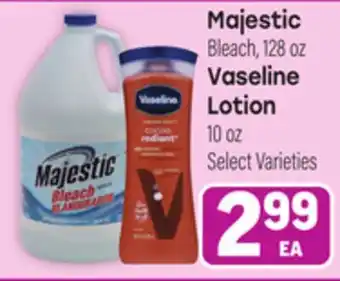 This offer is available in various stores, view all products to get the cheapest Majestic Bleach, 128 oz Vaseline Lotion 10 oz. If you'd like to find out whether this product has a bigger discount in another store, check the category 'Grocery'. You may also find these offers interesting: Vaseline Lotion 10 oz, Vaseline Lotion & Majestic Bleach.