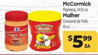 McCormick Pepinesa 14.53 oz Malher Consomé de Pollo 16 oz deals and online offers from the current Tony’s Fresh Market weekly ad
