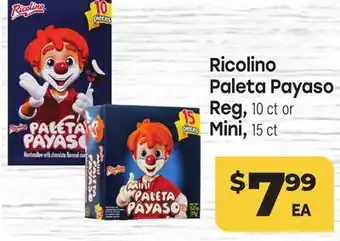 This offer is available in various stores, view all products to get the cheapest Ricolino Paleta Payaso Reg, 10 ct or Mini, 15 ct. If you'd like to find out whether this product has a bigger discount in another store, check the category 'Grocery'. You may also find these offers interesting: Ricolino Bubulubu, 8 ct or Mini Bubulubu, 1 5 ct, 25 ct. Mini Takis CHIPS & Pepsi 8 CT.-12 OZ. BOTTLES OR 12 CT.-12 OZ. CANS or Mini Coke 10 CT.-7.5 OZ. CANS.
