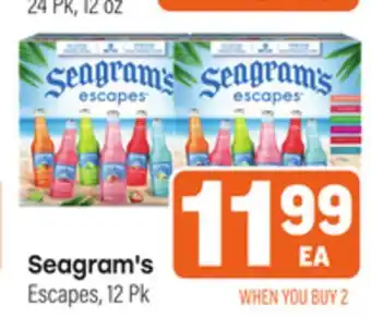 The price of Seagram's Escapes can be found at the top of the page, together with the dates during which the offer is available. You can also check the price in the current Tony’s Fresh Market weekly ad or on the Tony’s Fresh Market website. Promotional offers assure you of buying Tony’s Fresh Market products at the lowest price.