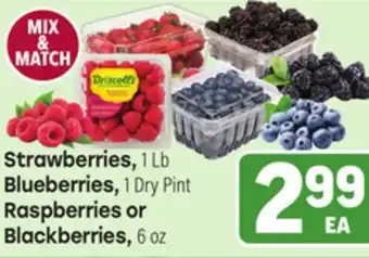 This offer is available in various stores, view all products to get the cheapest Strawberries, 1 Lb Blueberries, 1 Dry Pint Raspberries or Blackberries, 6 oz. If you'd like to find out whether this product has a bigger discount in another store, check the category 'Grocery'. You may also find these offers interesting: Strawberries 1 lb Blueberries 1 pint Raspberries, Blackberries, or Golden Berries 6 oz, Strawberries 16 oz Blueberries pint Red Raspberries, Blackberries, or Golden Berries 6 oz & 6 oz. Raspberries or Blackberries.