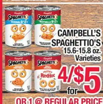 This offer is available in various stores, view all products to get the cheapest CAMPBELL'S SPAGHETTIO'S. If you'd like to find out whether this product has a bigger discount in another store, check the category 'Grocery'. You may also find these offers interesting: Campbell's Spaghettios, Campbell's soup & Campbell's Chunky Soups.
