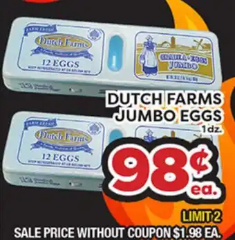 This offer is available in various stores, view all products to get the cheapest DUTCH FARMS JUMBO EGGS. If you'd like to find out whether this product has a bigger discount in another store, check the category 'Grocery'. You may also find these offers interesting: Dutch Farms Grade A LARGE EGGS, Dutch Farms Grade A LARGE EGGS & Dutch Farms CHEESE.