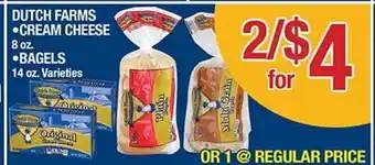 This offer is available in various stores, view all products to get the cheapest DUTCH FARMS • CREAM CHEESE • 8 oz. • BAGELS • 14 oz. Varieties. If you'd like to find out whether this product has a bigger discount in another store, check the category 'Grocery'. You may also find these offers interesting: Dutch Farms Bagels, 32 oz. Dutch Farms SHREDDED CHEESE & 7-8 oz. Select varieties. or Philadelphia Brick Cream Cheese 8 oz.