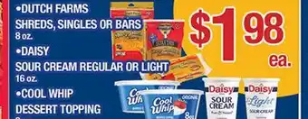 Dutch Farms Shreds, Singles or Bars, Daisy Sour Cream Regular or Light, Cool Whip Dessert Topping