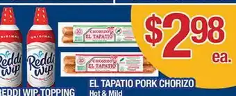This offer is available in various stores, view all products to get the cheapest EL TAPATIO PORK CHORIZO. If you'd like to find out whether this product has a bigger discount in another store, check the category 'Grocery'. You may also find these offers interesting: El Tapatio Queso Fresco 10 oz Sopes Chorizo, 12oz or Corn Sopes 22oz, EL TAPATIO SOUR CREAM & Pork Longaniza or Chorizo.