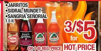 This offer is available in various stores, view all products to get the cheapest JARritos SIDRAl MUNDet SANGRIA SEÑORIAL. If you'd like to find out whether this product has a bigger discount in another store, check the category 'Grocery'. You may also find these offers interesting: Jarritos, Sidral Mundet, Sangría Señorial soda 11.16-12.5 oz or Mineragua sparkling water 12.5 oz, Jarritos, Sidral Or Sangria & Goya Coconut Water, 17.6oz Sangría, Sidral or Jarritos Select Drinks, 1.5 Liters.
