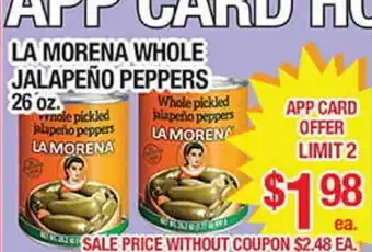 When is LA MORENA WHOLE JALAPEÑO PEPPERS on sale? or "I want to know if LA MORENA WHOLE JALAPEÑO PEPPERS will be discounted next week?" These are very common questions. Many people make a (shopping) list, with products that they are looking to buy next week. That’s why we always post next week’s flyers first. So you know exactly whether you need to wait a while before making a purchase or when to get it at the cheapest price. Keep an eye on our website to see if next week’s flyer has a deal on LA MORENA WHOLE JALAPEÑO PEPPERS.Will there be a promotion LA MORENA WHOLE JALAPEÑO PEPPERS next week?
