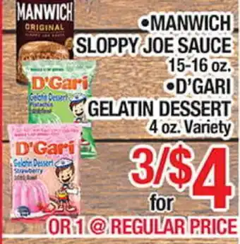 Current •MANWICH SLOPPY JOE SAUCE •D'GARI GELATIN DESSERT deal at Torres Supermercado from 4-02 until 10-02.