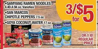SAMYANG RAMEN NOODLES, SAN MARCOS CHIPOTLE PEPPERS, GOYA COCONUT WATER Discount at Torres Supermercado