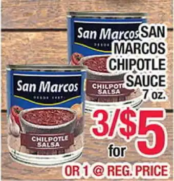 This offer is available in various stores, view all products to get the cheapest SAN MARCOS CHIPOTLE SAUCE. If you'd like to find out whether this product has a bigger discount in another store, check the category 'Grocery'. You may also find these offers interesting: San Marcos Sliced Jalapeños, San Marcos Whole Jalapeños & La Costeña Jalapeños or San Marcos Whole Jalapeños 26 oz. or Calida 11-16 oz.