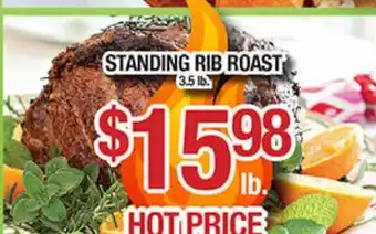 This offer is available in various stores, view all products to get the cheapest STANDING RIB ROAST. If you'd like to find out whether this product has a bigger discount in another store, check the category 'Grocery'. You may also find these offers interesting: Hy-Vee Choice Reserve bone-in beef standing rib roast, Premium Angus Presidential Cut Bone-In Standing Beef Rib Roast & Beef Rib Roast.