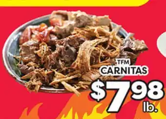 This offer is available in various stores, view all products to get the cheapest TFM CARNITAS. If you'd like to find out whether this product has a bigger discount in another store, check the category 'Grocery'. You may also find these offers interesting: BURRITO OR CARNITAS, TFM CAPIROTADA & TFM ROTISSERIE CHICKEN.