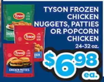 This offer is available in various stores, view all products to get the cheapest TYSON FROZEN CHICKEN NUGGETS, PATTIES OR POPCORN CHICKEN. If you'd like to find out whether this product has a bigger discount in another store, check the category 'Grocery'. You may also find these offers interesting: TYSON FROZEN FULLY COOKED CHICKEN NUGGETS, PATTIES OR POPCORN CHICKEN, Tyson Nuggets, Patties or Popcorn Chicken & 24-32 oz. Tyson FULLY COOKED CHICKEN Nuggets, Patties, or Popcorn.