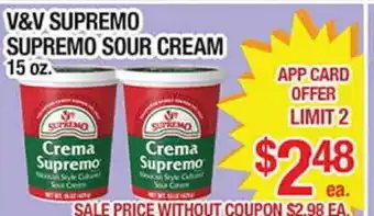 This offer is available in various stores, view all products to get the cheapest V&V SUPREMO SUPREMO SOUR CREAM. If you'd like to find out whether this product has a bigger discount in another store, check the category 'Grocery'. You may also find these offers interesting: V & V Supremo Shredded Cheese, V&V SUPREMO FRESCO CHEESE & V & V Supremo Queso Fresco.