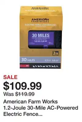 This American Farm Works 1.2-Joule 30-Mile AC-Powered Electric Fence Charger is now on deal at Tractor Supply Company. All information about current prices, promotional conditions, and durations can be found on this page. Also check out other comparable deals and promotions related to American Farm Works 1.2-Joule 30-Mile AC-Powered Electric Fence Charger, so you can always make the most cost-effective choice.The duration of the American Farm Works 1.2-Joule 30-Mile AC-Powered Electric Fence Charger deal is from 24-02-2026 to 02-03-2026. If the deal is no longer valid, you can look at other comparable offers. You can also follow the product category to stay informed as soon as American Farm Works 1.2-Joule 30-Mile AC-Powered Electric Fence Charger is on deal again at Tractor Supply Company. By comparing American Farm Works 1.2-Joule 30-Mile AC-Powered Electric Fence Charger deals, you'll know whether it's wise to wait on a purchase because it might have been cheaper or might come up cheaper in a future deal. So keep an eye on our site to see if American Farm Works 1.2-Joule 30-Mile AC-Powered Electric Fence Charger appears next week with a significant discount in the flyer.