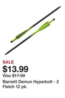 This offer is available in various stores, view all products to get the cheapest Barnett Demun Hyperbolt - 2 Fletch 12 pk. If you'd like to find out whether this product has a bigger discount in another store, check the category 'DIY'. You may also find these offers interesting: 6/Pk. of Liners, 3 Pk. Panties & 2 Pk. Small Chest.