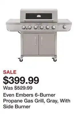 This offer is available in various stores, view all products to get the cheapest Even Embers 6-Burner Propane Gas Grill, Gray, With Side Burner. If you'd like to find out whether this product has a bigger discount in another store, check the category 'DIY'. You may also find these offers interesting: Cabela's Deluxe 4-Burner Event Grill and Griddle Combo, LEGO - Star Wars The Force Burner Snowspeeder 75414 & 21.4 cu. ft. Side-by-Side.