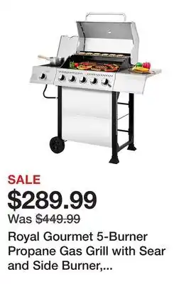 This offer is available in various stores, view all products to get the cheapest Royal Gourmet 5-Burner Propane Gas Grill with Sear and Side Burner, Gray. If you'd like to find out whether this product has a bigger discount in another store, check the category 'DIY'. You may also find these offers interesting: 4-Burner Gas Grill, Performance 4-Burner Gas Grill & Nexgrill 4-Burner Gas Grill.