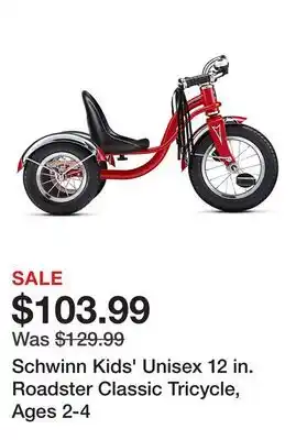 Tractor Supply Company offers a wide collection of products, besides the Schwinn Kids' Unisex 12 in. Roadster Classic Tricycle, Ages 2-4. Keep an eye on the weekly weekly ad to find the best offers and promotions. Besides Schwinn Kids' Unisex 12 in. Roadster Classic Tricycle, Ages 2-4, you can also find the following offers: TOMS Unisex Canvas Alpargata Classic Espadrilles (Infant Toddler), Unisex 471 Lifestyle Sneakers & Unisex 530 Lifestyle Sneakers.