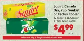 Current Squirt, Canada Dry, 7up, Sunkist or Cactus Cooler deal at Vallarta Supermarkets from 4-02 until 10-02.